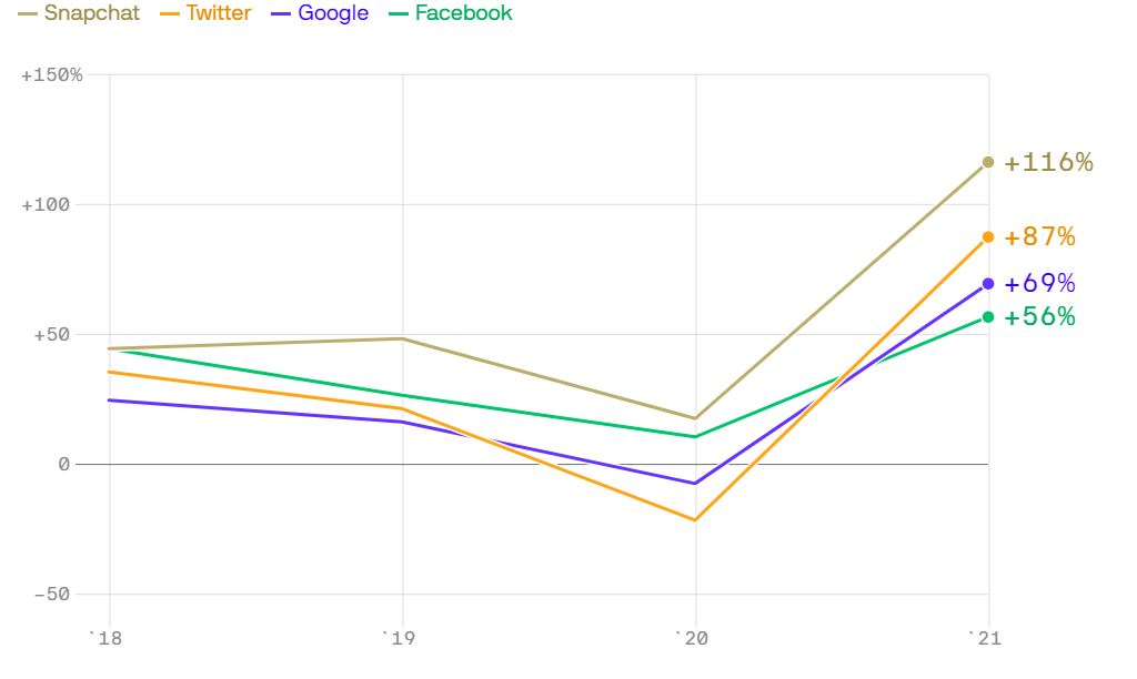 - 코로나 충격 : 지난 해 2분기는 펜데믹으로 인한 락다운 최고점 시기. 따라서 글로벌 광고 시장이 급격히 위축되었는데, 올해 2분기는 '정상으로의 복귀', '리오프닝'으로 광고 시장이 빠르게/ 큰폭으로 회복하는 시기였음. 즉 글로벌 광고 시장이 '최악' -> '최고' 로 변화한 도약의 2분기.
