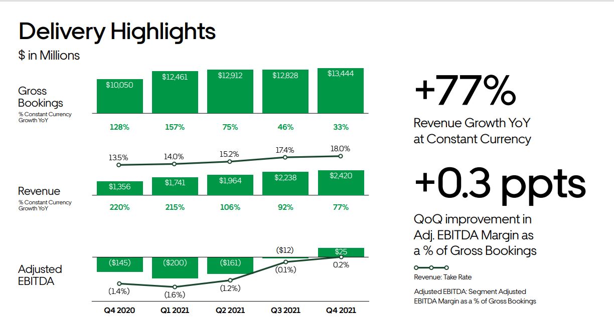 우버에게 펜데믹은 모빌리티 서비스가 직격탄을 입은 시기임과 동시에 딜리버리 서비스가 빠르게 성장 했던 기간 이었음. 직전 분기 까지 Uber Eats(우버 잇츠)를 포함하는 딜리버리 서비스는 계속해서 좋은 모습을 보여주긴 했음.