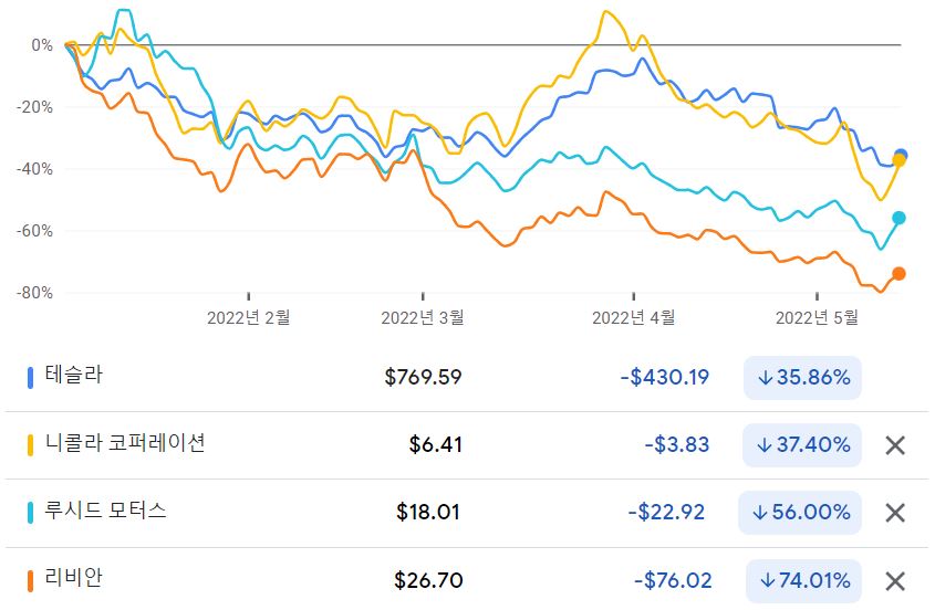 - Nikola(니콜라) / Lucid Motors(루시드) / Rivian(리비안)의 주가는 각각 37.4%, 56%, 74.01%로 하락 했음