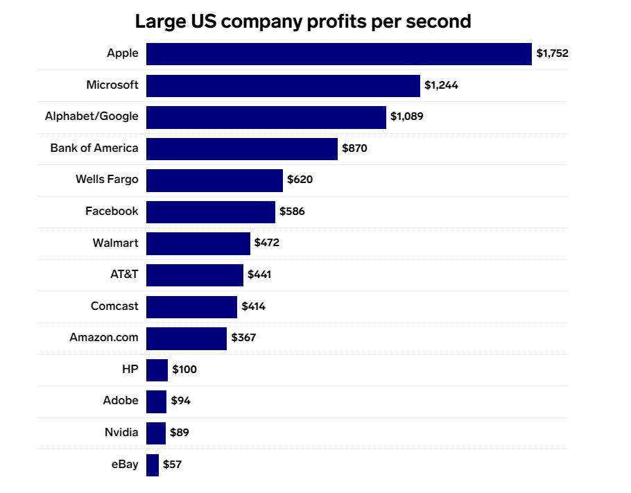 이 세개의 테크기업 외에 초당 순 이익 1,000달러를 넘는 기업은 2020년 기준으로 없다고 해요.