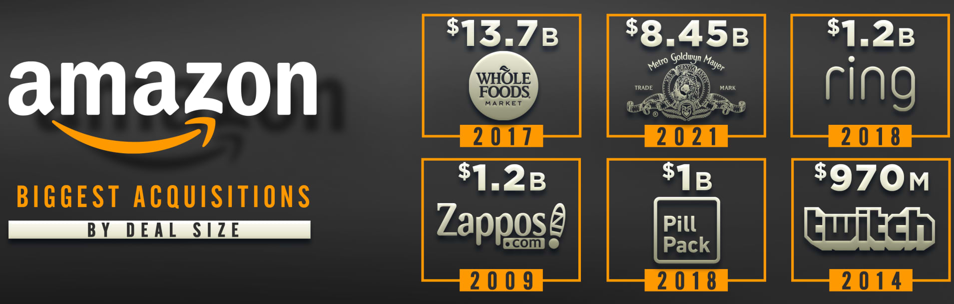 Amazon(아마존)이 제임스본드 시리즈의 제작사 MGM을 인수할 수 있다는 소식을 전해 드렸었는데. 현실화 되었음. 아마존의 인수 합병 역사상 두 번째로 큰 규모로 이번 인수 진행될 예정. 인수 금액이 무려 84억5,000만 달러. 참고로 2017년, 137억 달러로 홀푸드를 인수했는데 해당 인수가 아마존이 진행한 가장 큰 규모의 인수 사례.